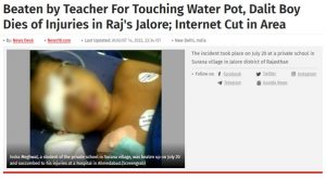 Indra Meghwal a nine year old student of Sarswati Vidya Mandir, Jalore in Rajasthan was beaten by his teacher on 20th July 2022. The crime of this boy, was that he drank from the water pot reserved for his upper caste teacher. This is the version of Indra’s parents and classmates.